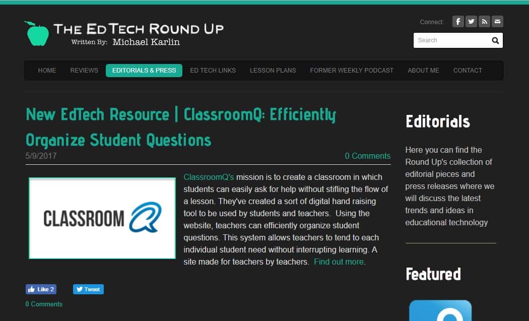 “ClassroomQ’s mission is to create a classroom in which students can easily ask for help without stifling the flow of a lesson. They’ve created a sort of digital hand raising tool to be used by students and teachers. Using the website, teachers can efficiently organize student questions. This system allows teachers to tend to each individual student need without interrupting learning. A site made for teachers by teachers…”